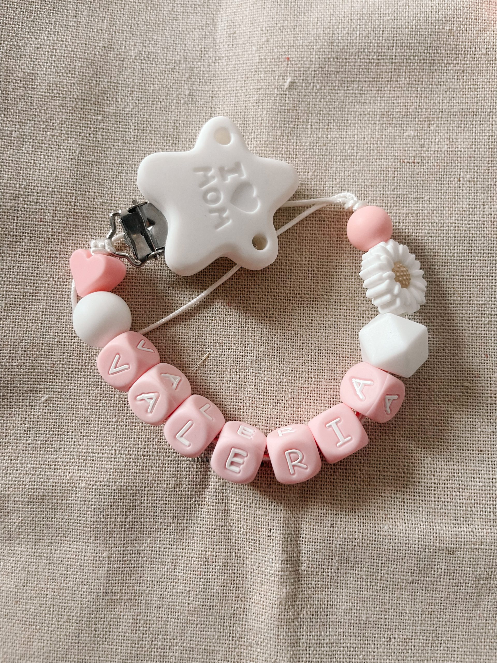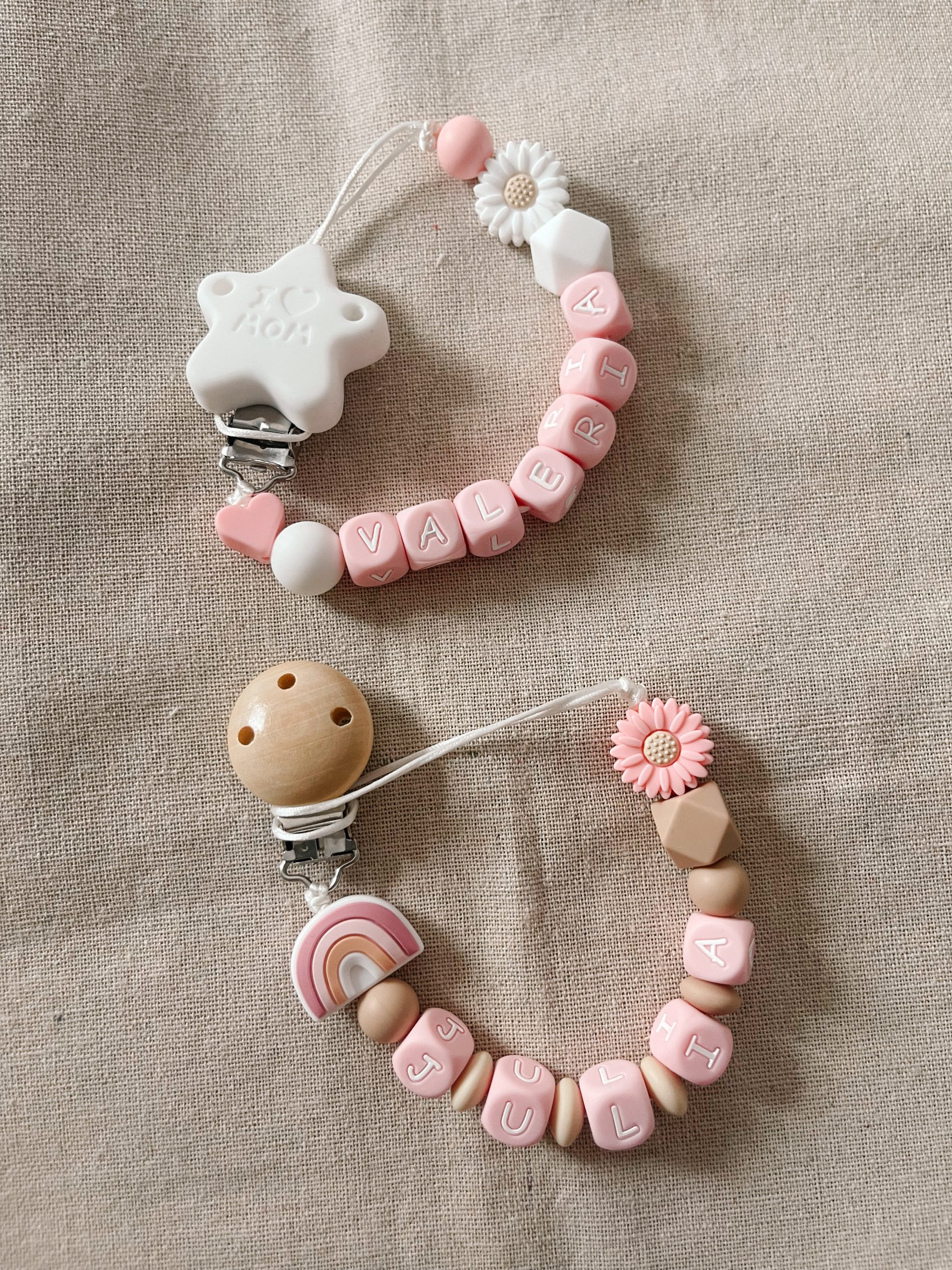 Chupetero de silicona personalizado con el nombre. NO tóxicos para el bebe. Recordar que el chupetero no es un juguete ni un mordedor, no hay que dejar que ele bebe lo chupe o lo muerda.