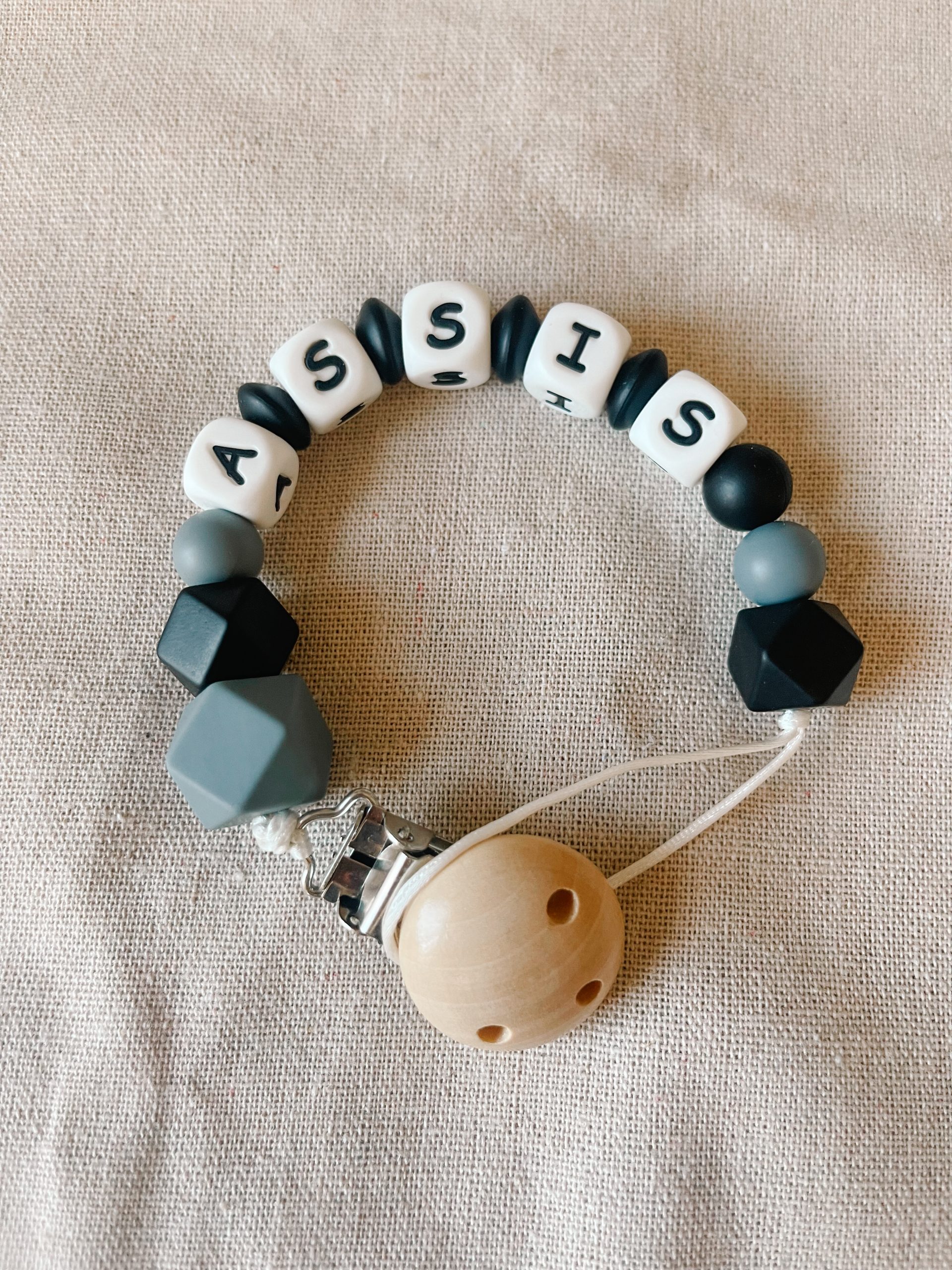 Chupetero de silicona personalizado con el nombre. NO tóxicos para el bebe. Recordar que el chupetero no es un juguete ni un mordedor, no hay que dejar que ele bebe lo chupe o lo muerda.