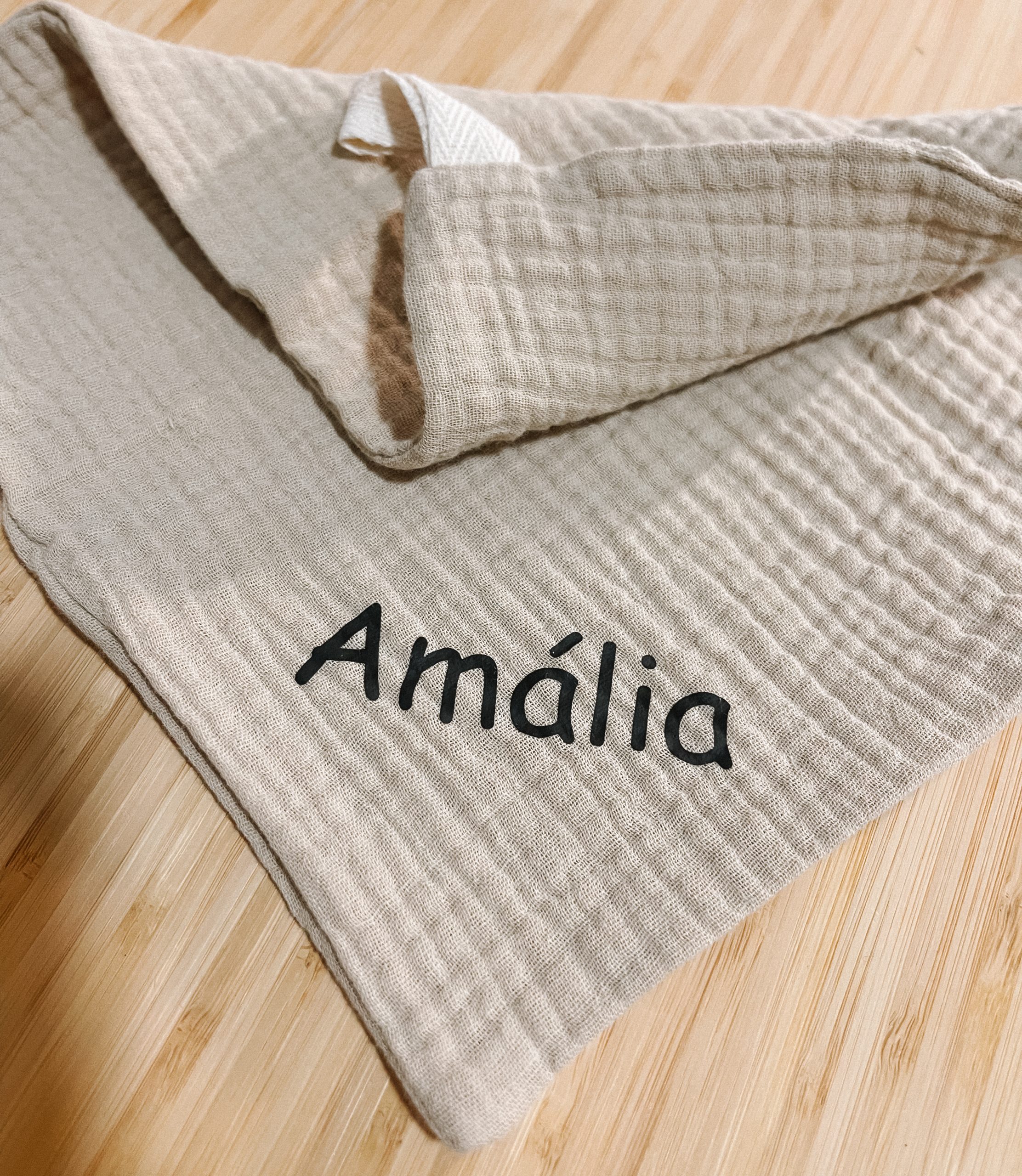 - Gasa multifuncional: Perfecta para limpiar, arropar o usar como babero improvisado, con un diseño único y personalizado con el nombre del bebé.